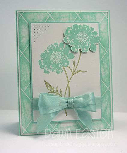 Stamps: Field Flowers; Cardstock: Whisper White, Pool Party; Inks: Pool Party, Pear Pizzazz; Accessories: Scoring Tool, Mat Pack and Paper Piercer, Pool Party Seam Binding, Dimensionals